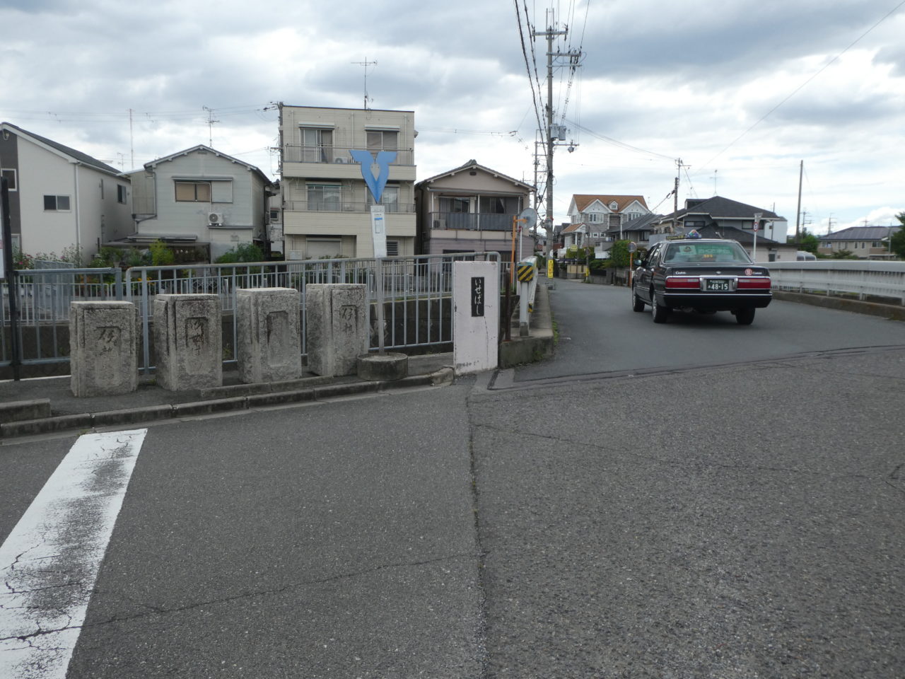 橋の横に石柱が4つ並んでいる。一つには伊勢橋と書かれているみたいだが、あとはよく読めない。