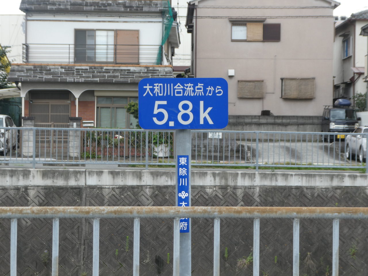 東除川、伊勢橋付近で大和川の合流点から5,8kmの表示