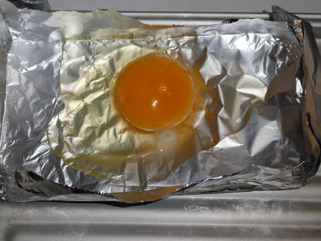 アルミホイルで皿を作って、玉子を1つ。